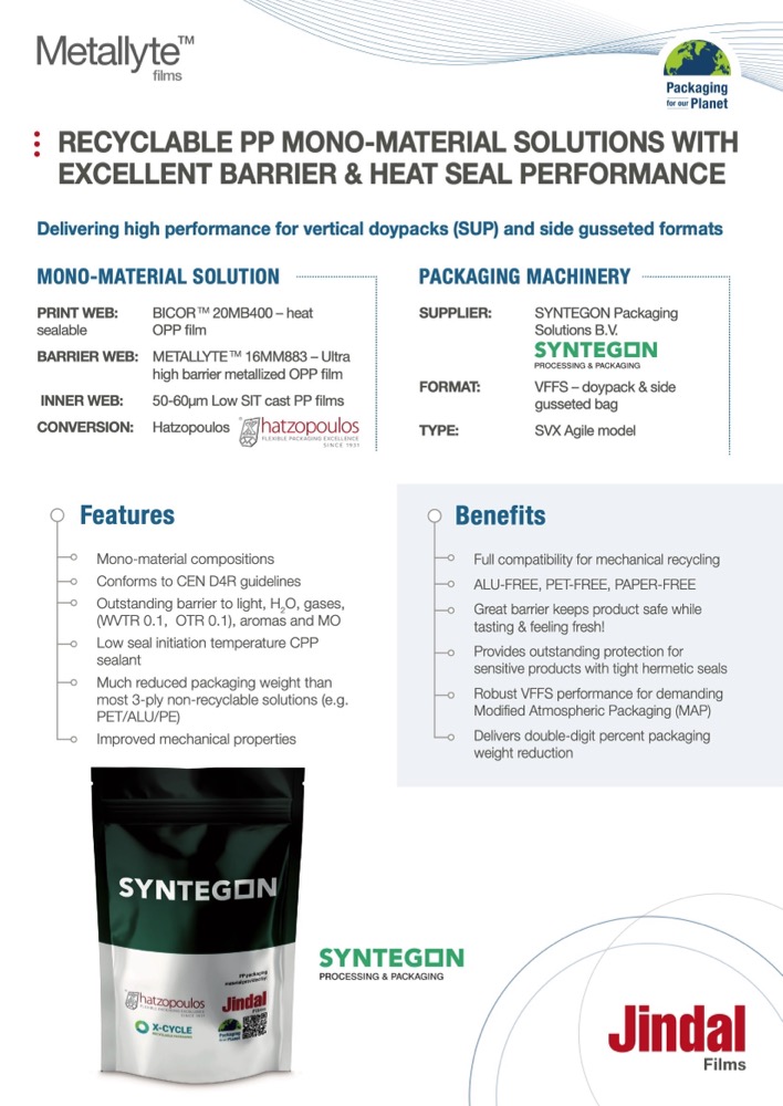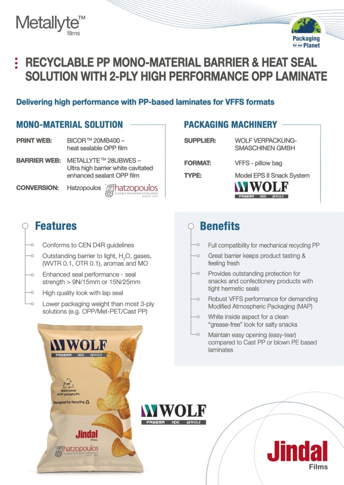 In summary, PP mono-material solutions from Jindal Films provide numerous OPP film options – printable, barrier and heat sealable – to help brand-owners and converters launch their multi-material flexible packaging laminates on a journey towards a more sustainable future, feeding the PP recycling streams being progressively implemented across Europe.